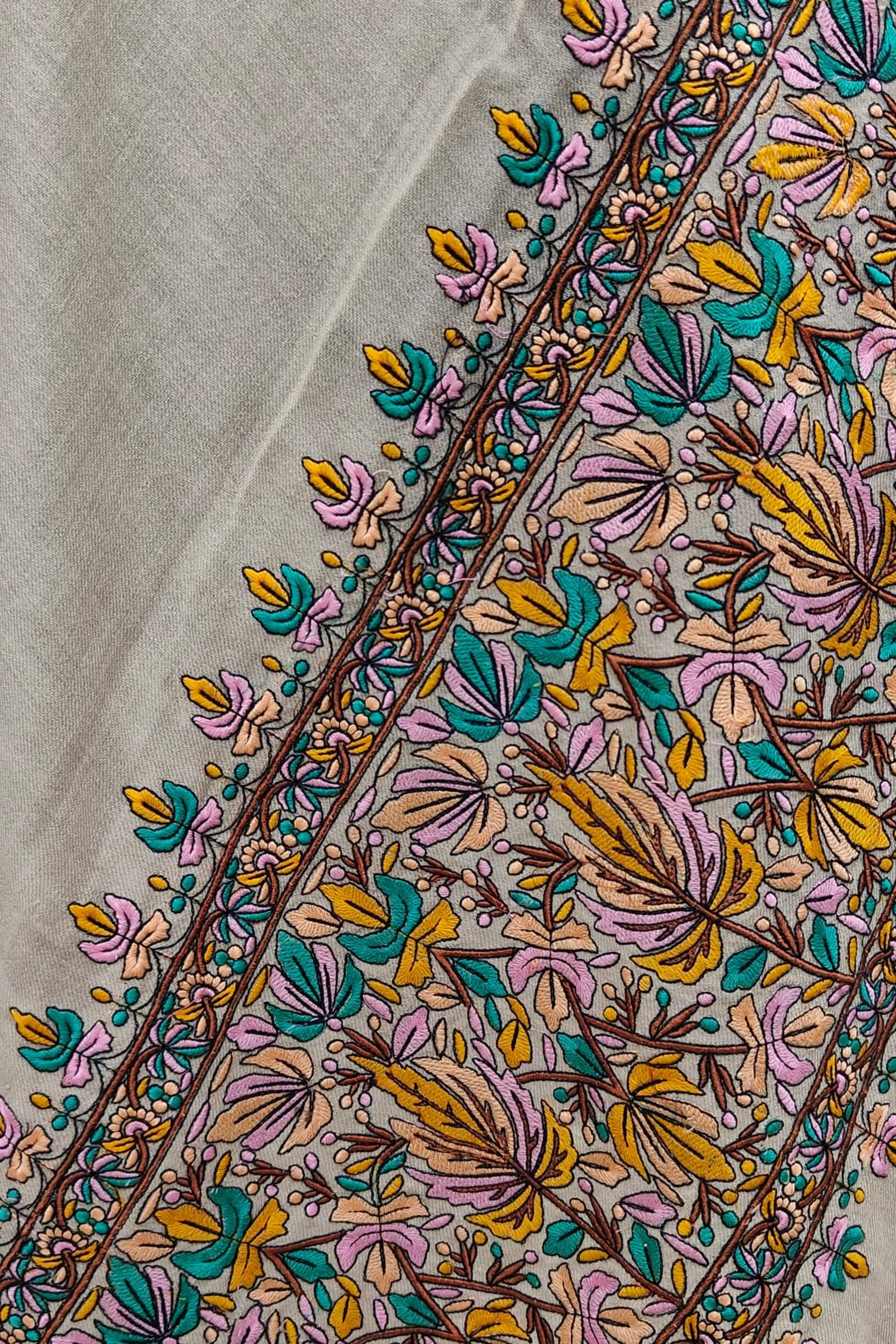 Exquisite Papier Mache. Post weaving, a shawl is machine embroidered in colourful threads using thicker strokes, crafting design similar to hand painting.